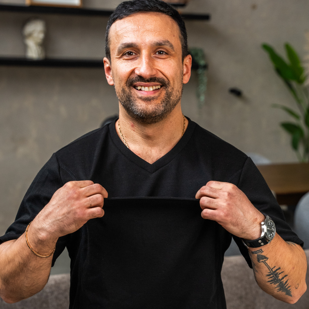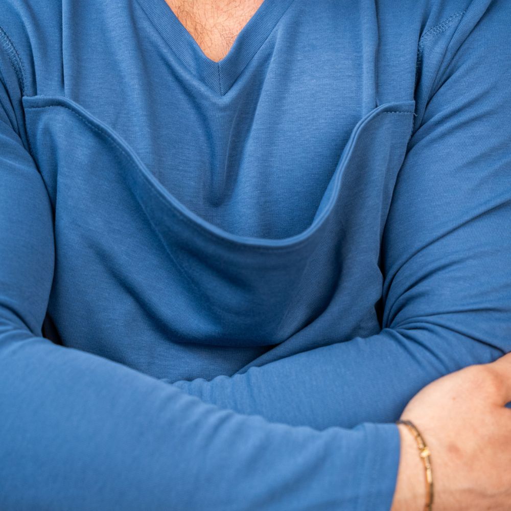 T-shirten har en diskret og sikker lomme på brystet, hvor du kan placere din baby for hud-mod-hud-kontakt. Den er nem at tage på – du trækker den blot over hovedet som en almindelig t-shirt.